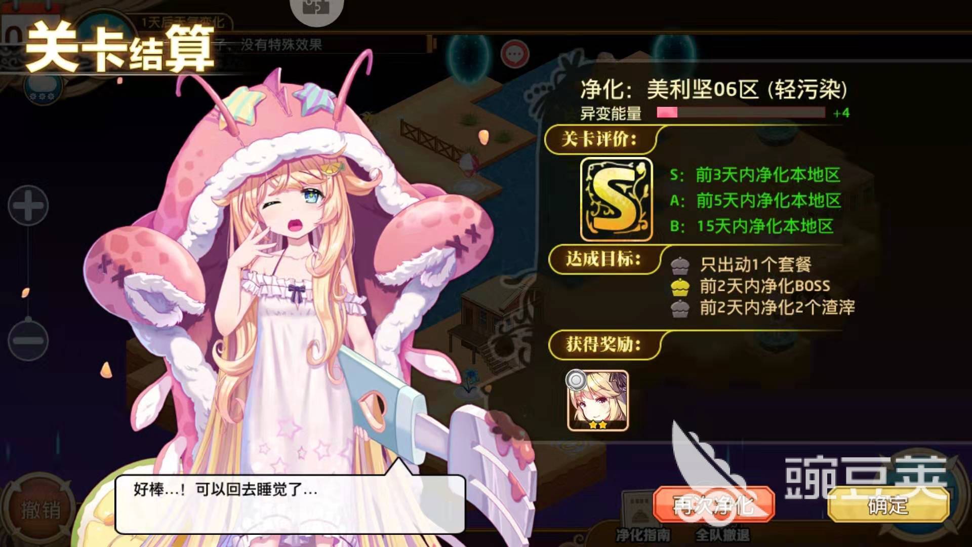 最后是可以得到S的评价,净化的其中一个任务就完成,我们就完成了其中一个目标。